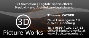 3D Picture Works bietet seit 2005 professionelle Qualität im Bereich 3D Computergrafik, Compositing und Bildbearbeitung. Das Angebot reicht von fotorealistischen Standbildern bis hin zu Industrievisualisierungen, wie komplett animierte mechanische Fertigungsstraßen oder auch 3D-Montageanleitungen. Weiters umfasst das Angebot Architekturvisualisierungen, Digitale Spezialeffekte wie Flüssigkeits- und Partikelsimulationen, Produktvisualisierung, Interaktive 3D Objekte, Digitales Compositing wie Camera Tracking und 3D/2D Integration, Werbespots u.a. für Messen, Fulldometaugliche 3D-Animationen und Panorama-Fotografie.Standort / Routenplan